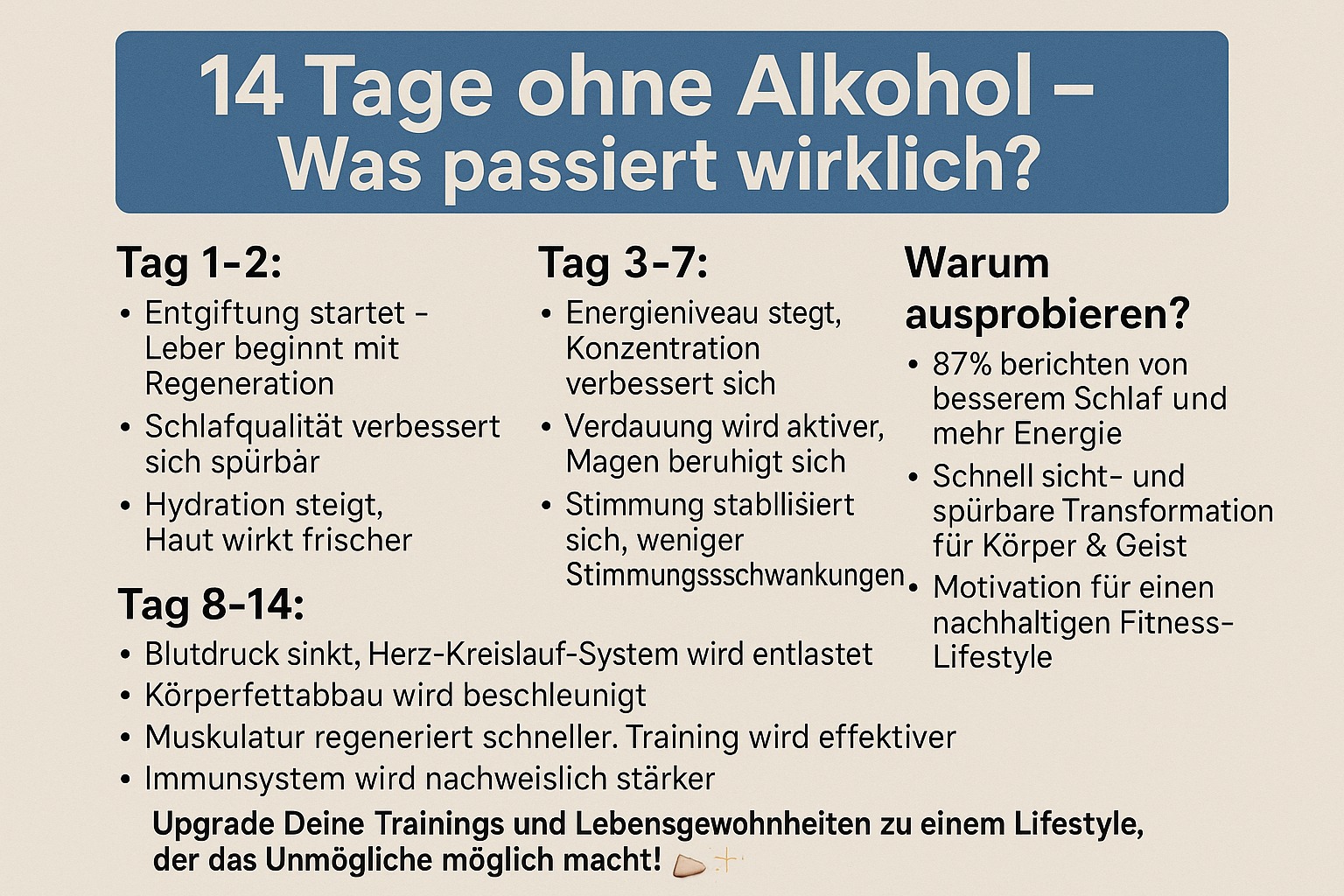 In diesem Artikel erfährst Du, welche erstaunlichen Transformationen Dein Körper während einer 14-tägigen Alkohol-Auszeit durchläuft – wissenschaftlich fundiert und aus meiner langjährigen Erfahrung als Personal Trainer bestätigt.