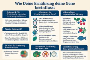 Epigenetik – wie Ernährung Deine Gene formt Deine Nahrung programmiert Deine Gene – die faszinierende Welt der Nutri-Epigenetik Stell Dir vor, jede Mahlzeit, die Du zu Dir nimmst, sendet kleine Signale an Deine Gene und beeinflusst, welche aktiviert oder deaktiviert werden. Klingt wie Science-Fiction? Ist aber pure Wissenschaft! Die Epigenetik zeigt uns, dass unsere Gene … Epigenetik – wie Ernährung Deine Gene formt weiterlesen